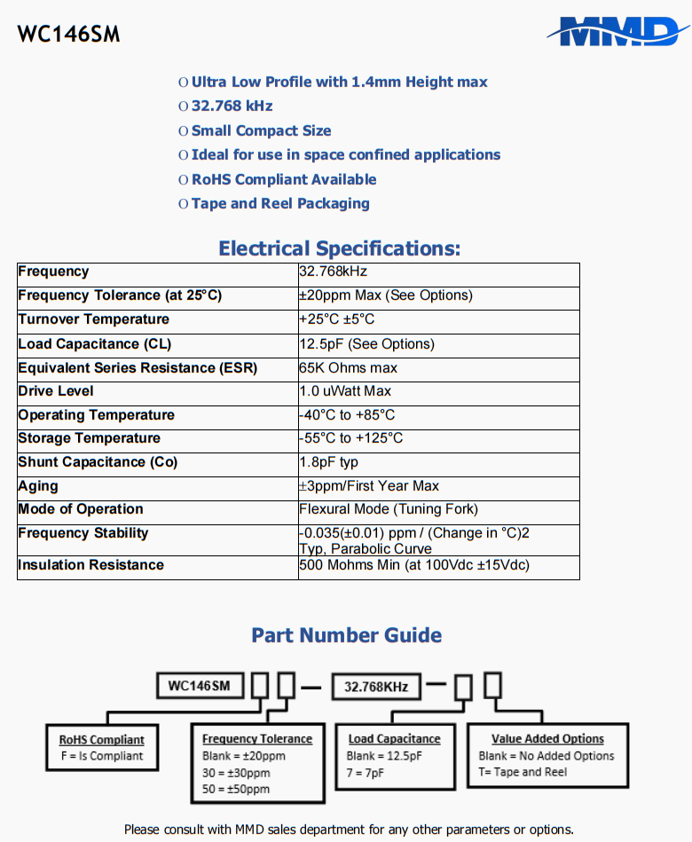 WC146SMF-32.768KHZ-T | MMD | WC146SM | -40°C ~ 85°C | 32.768 kHz | ±20ppm | 12.5 pF | |