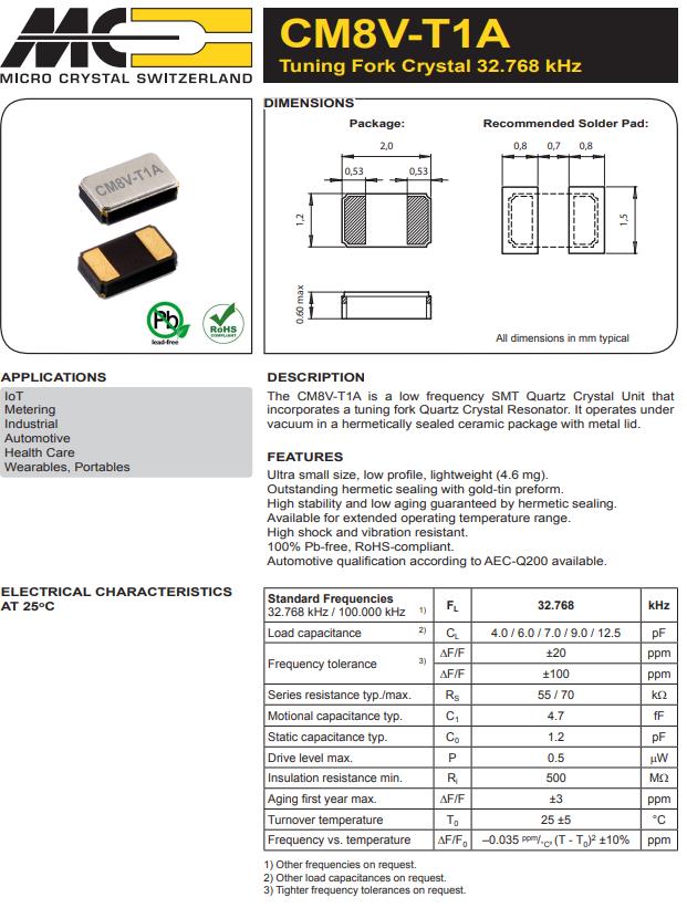 CM8V-T1A-32.768kHz-12.5pF-20PPM-TA-QC | Micro晶振 | 晶體 32.768 kHz 12.5 pF +/-20 PPM -40/+85C |