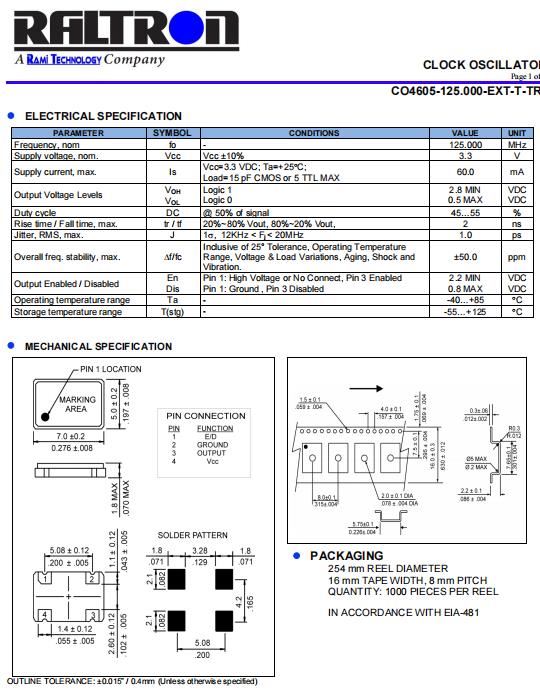CO46 系列 125 MHz 7 x 5 mm 3.3 V ±50 ppm 表面貼裝 時鐘振蕩器 | |||||||
