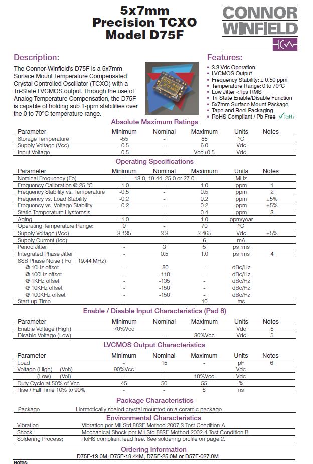 D75F-025.0M | Connor-Winfield 進口TCXO晶振 | D75F | 25MHz | 0°C ~ 70°C |
