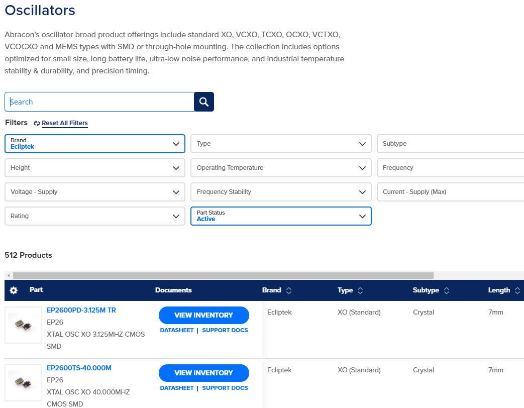 Ecliptek oscillator broad product offerings include standard XO, VCXO, TCXO, OCXO, VCTXO, VCOCXO and MEMS types with SMD or through-hole mounting. The collection includes options optimized for small size, long battery life, ultra-low noise performance, and industrial temperature stability & durability, and precision timing.