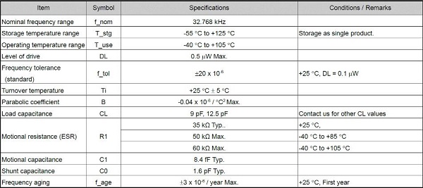 它的具體性能特性小編就不多說了,直接上參數規格表,懂的朋友絕對會眼前一亮的.但是應用領域還是要說一下的,畢竟這關系到這款產品的主要應用領域,這款產品就是應用在副時鐘無線模塊,穿戴式產品,副時鐘低功耗MCU等功能模塊或是設備上.參數如下圖: