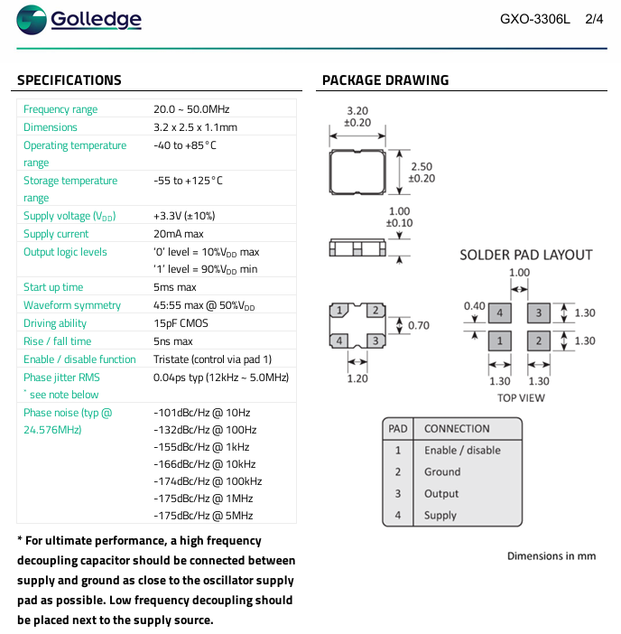MP11162 | Golledge | 48.0 MHz GXO-3306L/B Ultra-Low J | GXO-3306L | 3.3V | ±50ppm | -40°C ~ 85°C | 4 | 3225 |