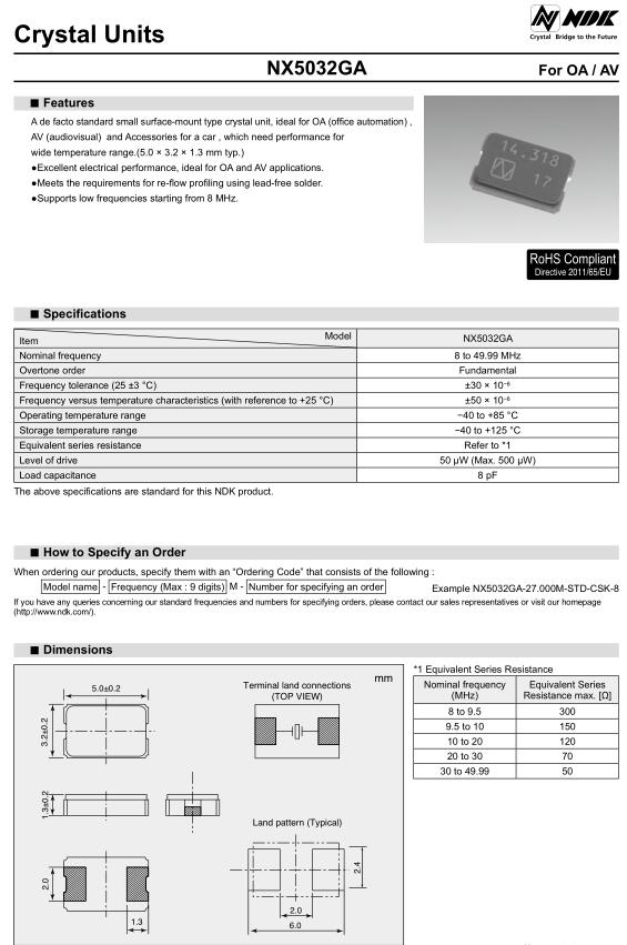NX5032GA-16.000000MHZ-LN-CD-1 | NDK | CRYSTAL 16.0000MHZ 8PF SMD | ±50ppm | -10°C ~ 70°C | 2 | 5032 |