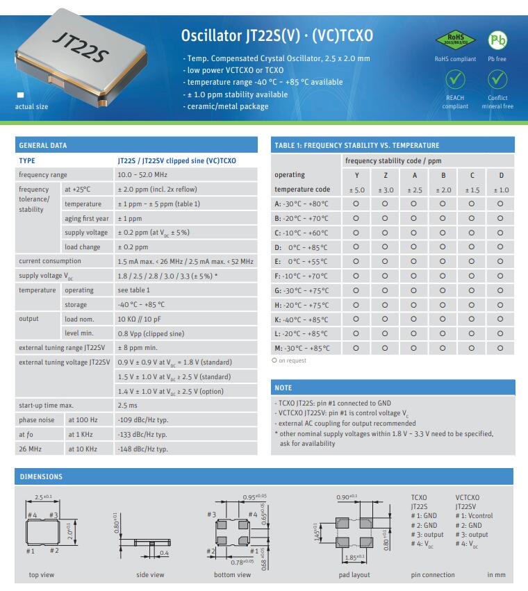 O 26,0-JT22S-B-K-3,3-LF | Jauch Quartz | XTAL OSC TCXO 26.0000MHZ SNWV | TCXO | 削峰正弦波 | 3.3V | ±2ppm | -40°C ~ 85°C | 4 | 2520 |