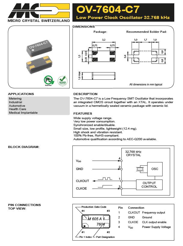 隨之不久微晶公司發(fā)布了編碼OV-7604-C7-32.768kHz-20PPM-TB-QC,型號OV-7604-C7是一款低功耗時(shí)鐘石英晶體振蕩器32.768kHz,也是一款低頻SMT振蕩器,集成了CMOS電路和XTAL。它在真空下工作在一個(gè)密封的陶瓷包與陶瓷蓋。