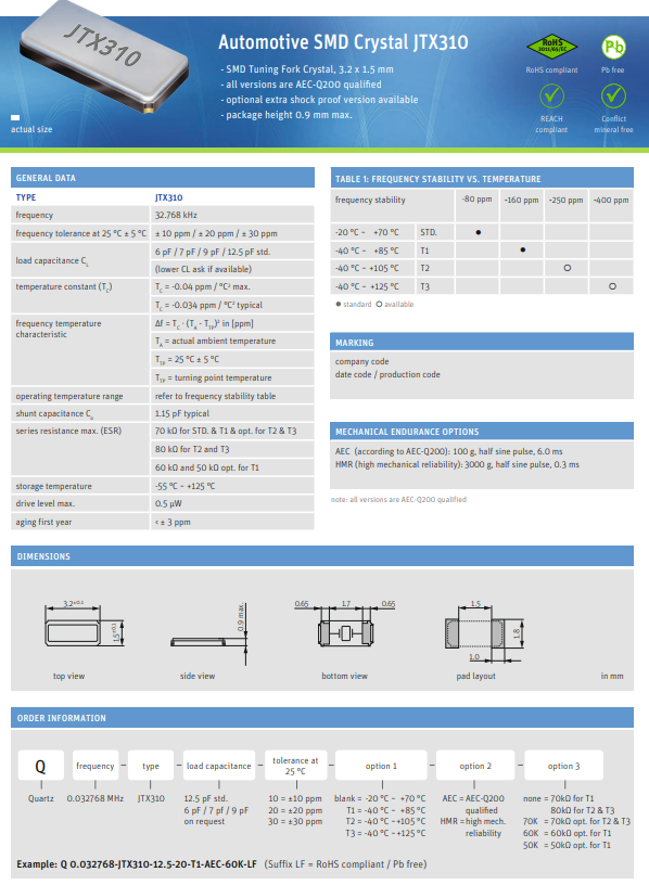 Q 0.032768-JTX310-7-20-T3-HMR-LF | Jauch Quartz | JTX310 | 32.768kHz | ±20ppm | 7pF | -40°C ~ 125°C | 2 | (3.20mm x 1.50mm) | 0.035" (0.90mm) |