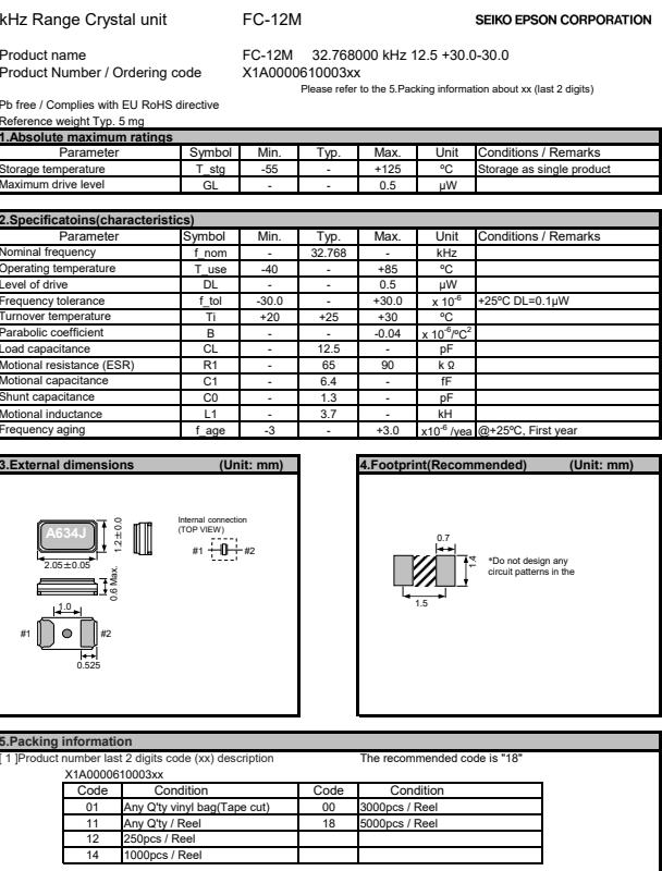 X1A000061000300 | 2.05 x 1.2 x 0.6 mm | FC-12M | 32.768kHz | 12.5 pF | +/-30.0 ppm | -40 to +85 °C |