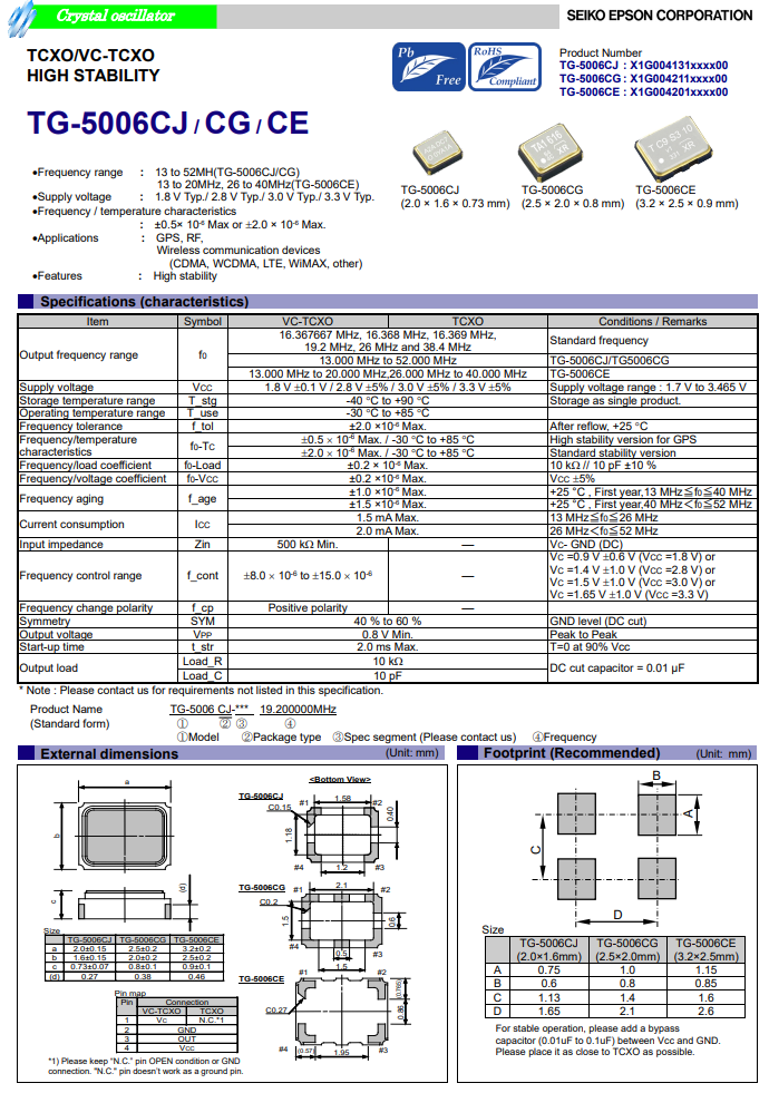 X1G0041310016 | TG-5006CJ | 19.200000 MHz | 2.00 x 1.60 x 0.73 mm | Clipped sine wave | -30 to +85 °C | +/-1ppm | +/-2.0 ppm |