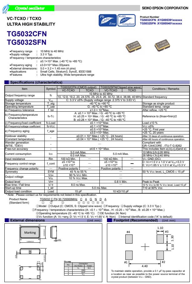 X1G005401001800 | TG5032SFN | 30.720000 MHz | 5.00 x 3.20 x 1.45 mm | Clipped sine wave | 3.135 to 3.465 V | +/-1.0 ppm | -40 to ++85 °C |