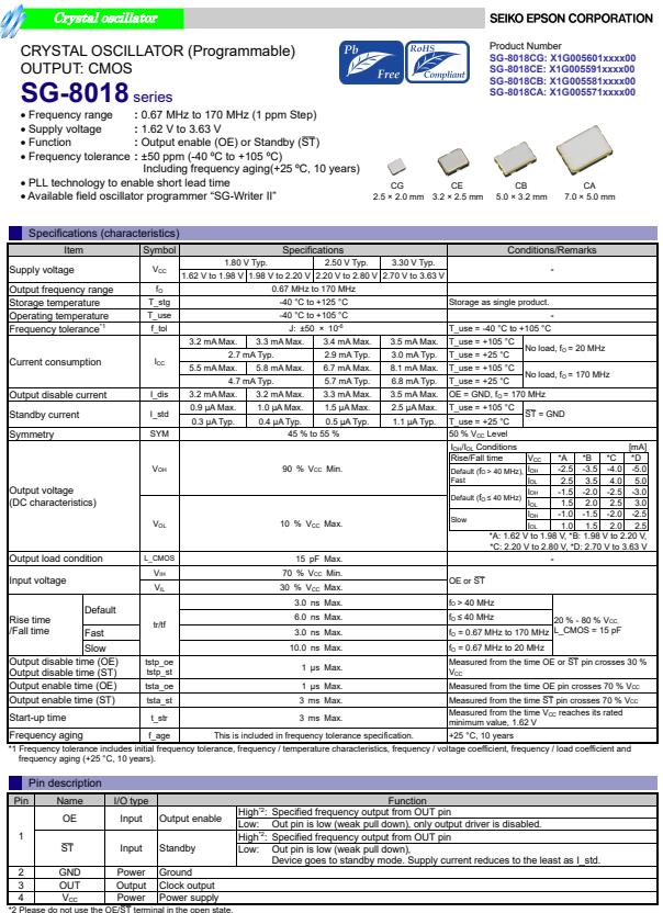 X1G005581003400 | SG-8018CB | 8.000000 MHz | 5.00 x 3.20 x 1.30 mm | CMOS | 1.620 to 3.630 V | -40 to 105 °C | +/-50 ppm |