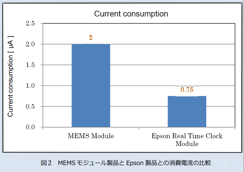 MEMS模塊產(chǎn)品,音叉石英晶體都是一樣的,難以實(shí)現(xiàn)低頻率,所以比較容易制造數(shù)百KHz成都的產(chǎn)品,用以時(shí)鐘的振蕩頻率和作為目的的頻率分周.圖二所示的是EPSON模塊產(chǎn)品和MEMS模塊的產(chǎn)品耗電說明.