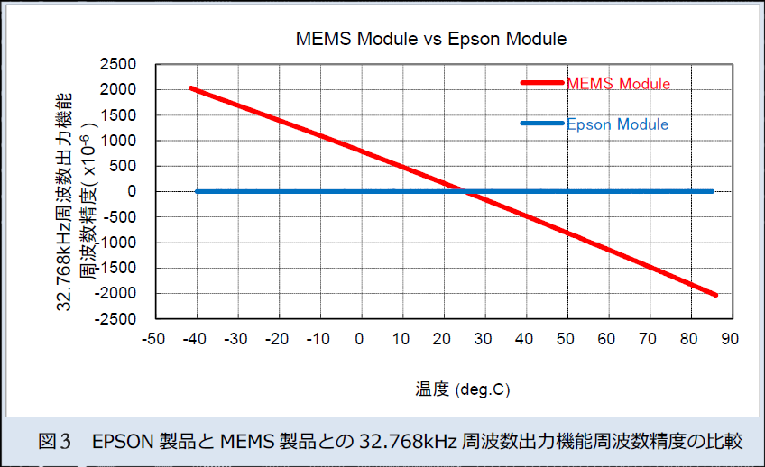 在客戶方面,從手表用的音叉晶振32.768K頻率輸出的情況來看,頻率要求必須是高精度的.圖三所示的就是EPSON產(chǎn)品和MEMS產(chǎn)品的32.768KHz頻率輸出所顯示的溫度特性.
