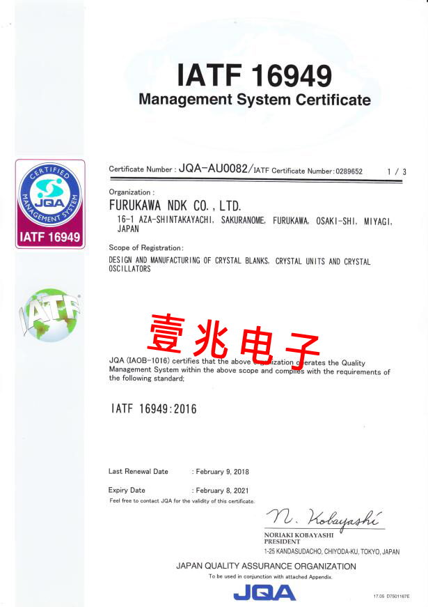 - [2019-07-01]日本NDK晶振IATF 16949汽車認證...
