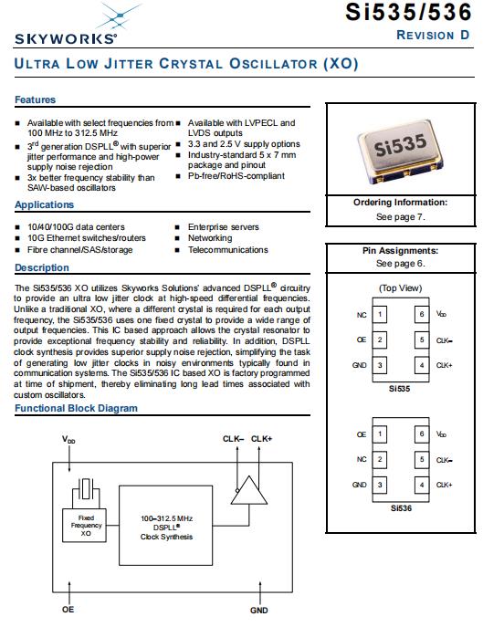 The Si535/536 XO utilizes Skyworks Solutions’ advanced DSPLL® circuitry to provide an ultra low jitter clock at high-speed differential frequencies. Unlike a traditional XO, where a different crystal is required for each output frequency, the Si535/536 uses one fixed crystal to provide a wide range of output frequencies. This IC based approach allows the crystal resonator to provide exceptional frequency stability and reliability. In addition, DSPLL clock synthesis provides superior supply noise rejection, simplifying the task of generating low jitter clocks in noisy environments typically found in communication systems. The Si535/536 IC based XO is factory programmed at time of shipment, thereby eliminating long lead times associated with custom oscillators.
